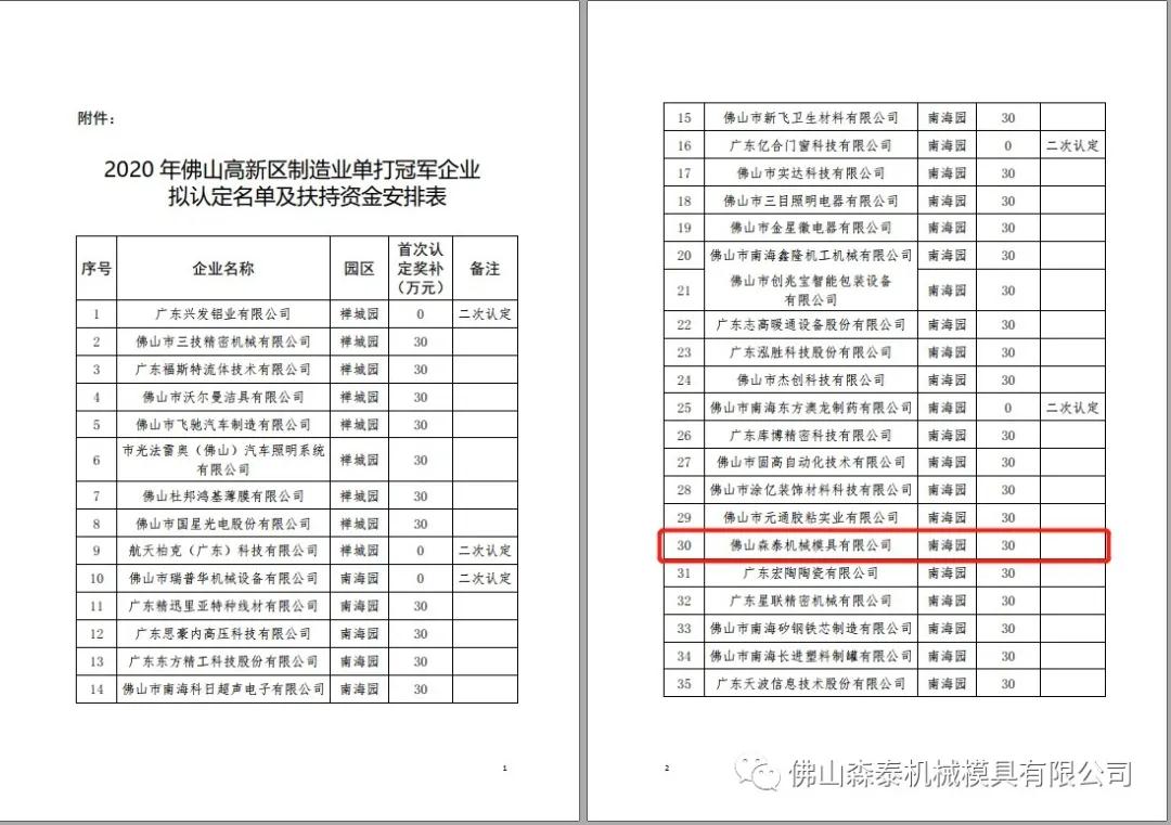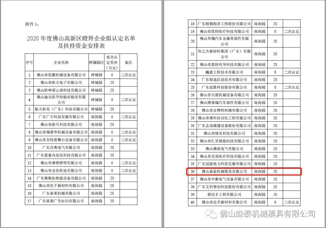 佛山森泰機械模具有限公司根據相關扶持政策及申報指南要求遞交相關申報材料,根據2020年12月9日佛山高新區官方網站公告,佛山高新技術產業開發區管理委員會已完成2020年制造業單打冠軍企業及瞪羚企業認定項目審核、評審工作,已經就2020年佛山高新區制造業單打冠軍企業及瞪羚企業擬認定名單及首次認定獎補資金予以公示。